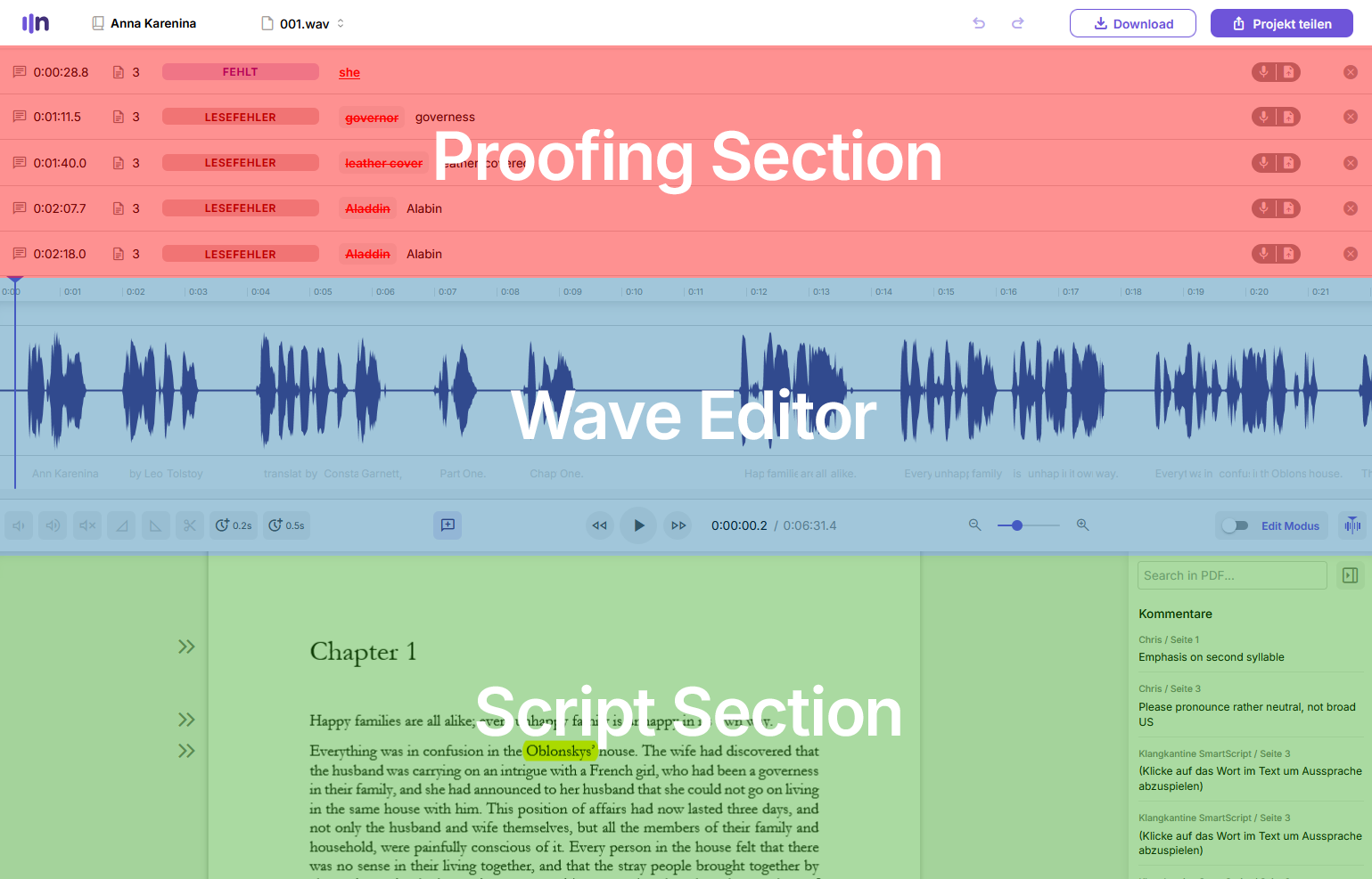 - Text markers: add comments like “Check emphasis here” or “Correct name pronunciation.”