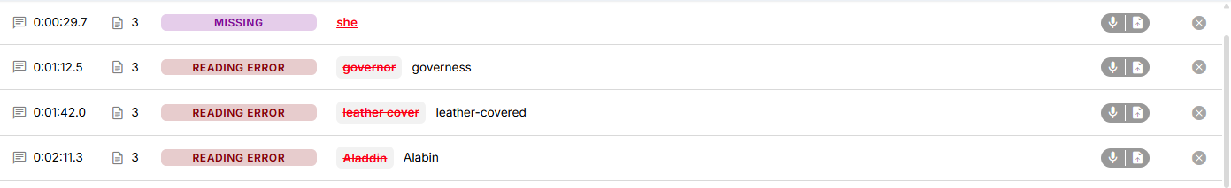- Difference highlights — visual indicators that show which words differ (e.g., omitted, added, or substituted).
