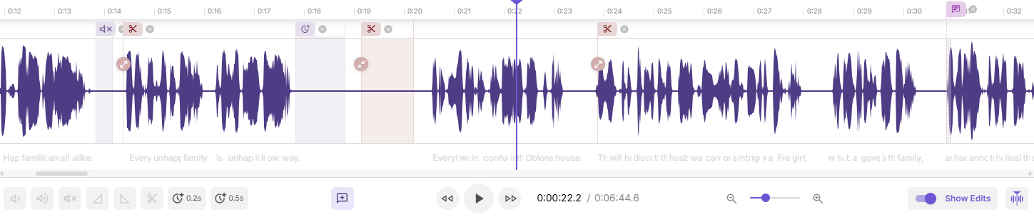 Once you have "Show Edits" enabled, you can review and modify all the audio edits done by Narrafix or anyone using Narrafix Studio.