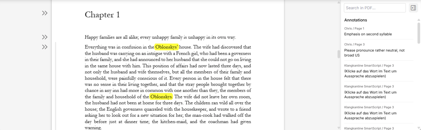 Optional annotations imported from the original PDF (such as director’s notes, character tags, or comments). The annotations bar can be showed or hidden with the corresponding button